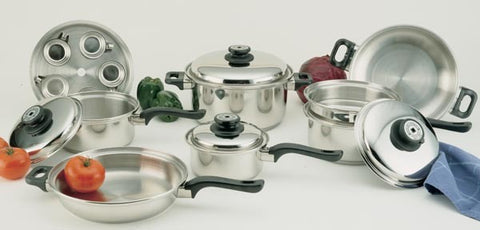 Each piece of our World’s Finest 7-Ply Steam Control cookware is constructed of extra heavy 304 surgical stainless steel and guaranteed to last a lifetime. The 7-ply construction spreads the heat quickly and evenly. The steam control valve makes waterless cooking easy and more healthy because it eliminates the need for grease or oil. To use the steam control valve, start cooking on medium heat (never use high heat). Then, when the valve begins to whistle, close the valve and turn the heat down to low and finish cooking. The 7-ply construction allows you to stack cook with this waterless cookware set. Begin cooking on individual burners and when the valve whistles, you can stack the pans to finish cooking. The phenolic handles are superbly styled and are resistant to heat, cold and detergents. This wholesale cookware set consists of a 1.7qt covered saucepan, 2.5qt covered saucepan, 3.2qt covered saucepan, 7.5qt covered roaster, 11 3/8” skillet, double boiler unit with capsule bottom so you can use as a 3qt saucepan, 5 egg cups, 5 hole utility rack and high dome cover with capsule bottom so you can use as a frying pan (cover fits skillet or roaster). Comes with a lifetime warranty. Before you invest up to $2000 in a set of 7-ply cookware, consider our advantages and superior features. Gift boxed